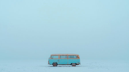 Vintage blue van in a snowy landscape, conveying a serene winter atmosphere with a minimalist background and cool color palette for travel enthusiasts