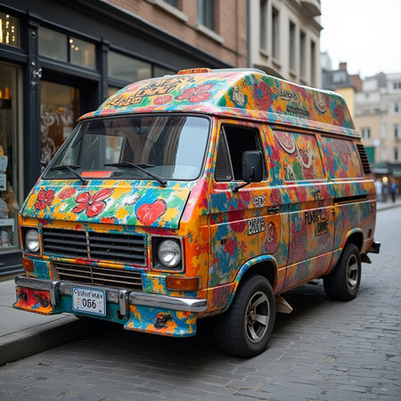 A vibrant vintage van adorned with captivating graffiti art, representing urban street culture and creative expression. Ideal for travel, adventure, and lifestyle themes.