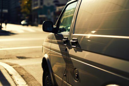 Sunlit urban van parked on city street corner reflecting golden afternoon light and modern buildings in the background.