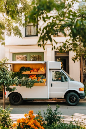 A delivery truck filled with vibrant fruits and vegetables is parked by a cozy neighborhood home.