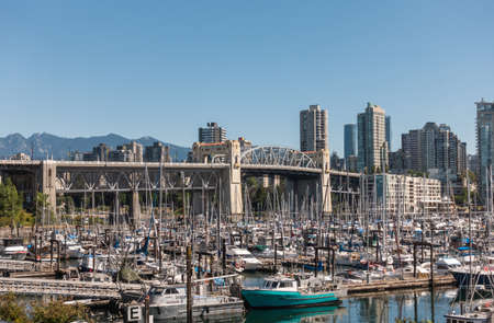 Vancouver, Canada - July 15, 2018: Burrard Bridge with plenty of yachts and boat of Fishermens wharf up front under blue sky.