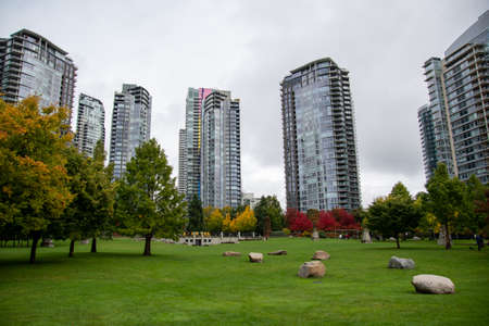 Modern city park on skyscrapers background sunny day time. Vancouver day cityscape