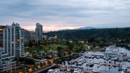 Vancouver city skyscrapers at sunrise in summer. Coal Harbor waterfront modern buildings.