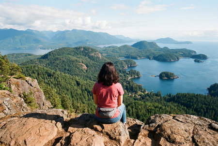 A young woman in a red shirt sits alone on a high rocky cliff edge admiring the breathtaking landscape of green forests islands and blue ocean under a sunny sky in vancouver island canada.