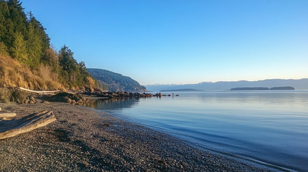 A breathtaking coastal scene at dawn with tranquil waters reflecting the soft morning light, surrounded by lush greenery and distant mountains.