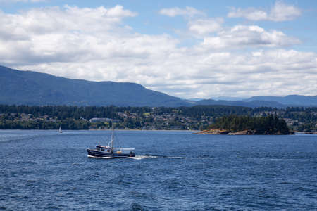 SIDNEY, CANADA - JULY 14, 2019: boat in haro strait view from Vancouver island with cloudy sky British Columbia Canada