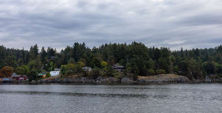 Panoramic View of a Cosy Homes on the rocky coast during a sunny summer day. Taken on Galiano Island near Vancouver Island, BC, Canada.