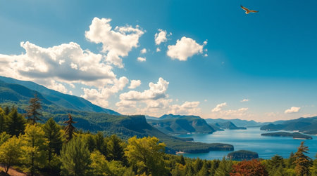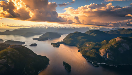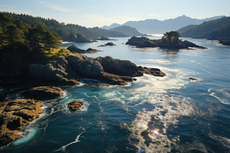 Aerial view of the sea and mountains. Beautiful nature of Norway, Landscape of Tofino covered in greenery surrounded by the sea in the Vancouver Islands, Canada, AI Generated