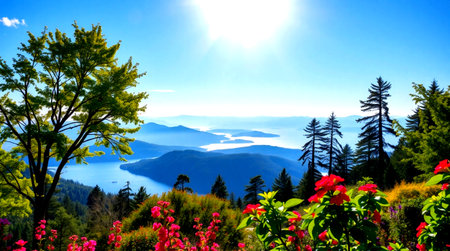 Canadian Nature Mountain Landscape Background. Sunny Colorful Sunset Sky Art Render. View of Howe Sound, between Squamish and Vancouver, British Columbia, Canada.