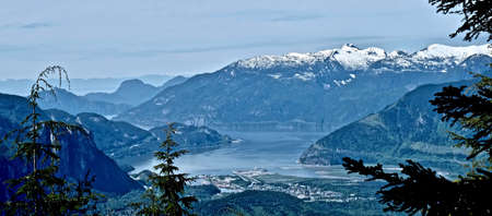 Idyllic view of ocean, mountains and islands. Panorama of a little city by the ocean among mountains. Squamish. Whistler. Vancouver. British Columbia. Canada.