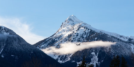 Snow Covered Mountain Peak during sunny winter day. Airplane Flying. Squamish, British Columbia, Canada.