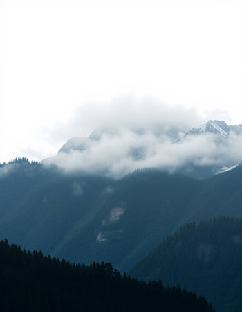 The image captures a scenic view of a mountain range with snow-covered peaks, enveloped by clouds. Lush green trees fill the foreground, with varying shades of blue and white forming the sky. This photograph, with its natural lighting and detailed composition, is suitable for travel, environmental, or landscape-related commercial uses.