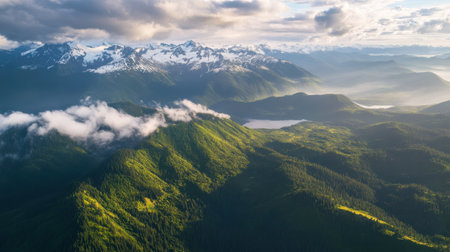 Aerial View from Airplane of Canadian Mountain Landscape, Tantalus Range. Sunny Sunset Art Render. Taken between Squamish and Whistler, North of Vancouver, BC, Canada.