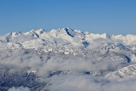 Beautiful snow-capped Columbia Mountains against the blue sky in British Columbia Canada.
