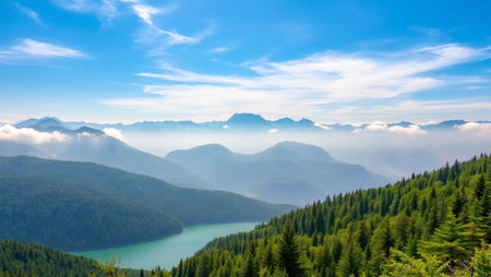 panoramic view of the mountain lake and forest in the morning
