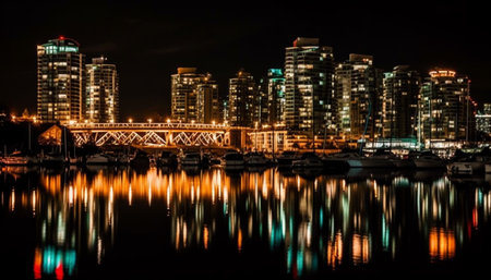 Colorful skyline shimmering on the water at night, showcasing vibrant city lights and modern architecture reflecting in bay