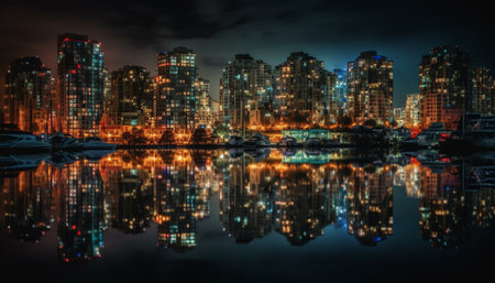 Majestic skyscrapers illuminate the night sky, their reflections dancing on calm waters