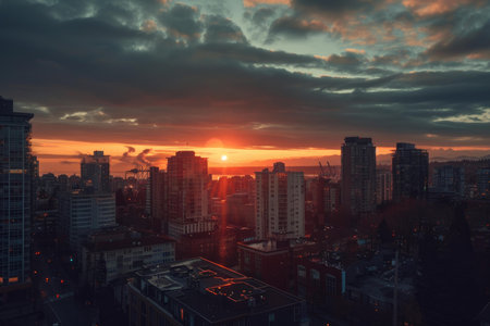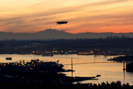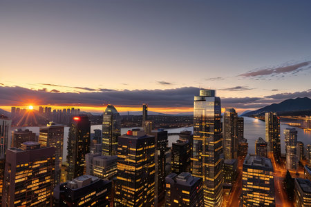 Aerial view of Vancouver skyline at sunset, British Columbia, Canada