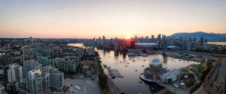 False Creek, Vancouver, British Columbia, Canada. Aerial Panoramic View of a Modern Downtown City View. Dramatic Colorful Sunset Sky.