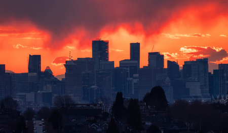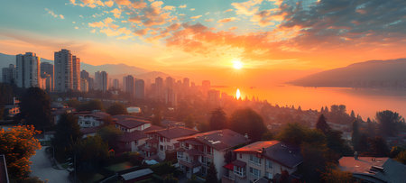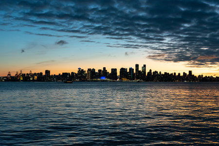 Commercial buildings and Cityscape Skyline of Downtown Vancouver Viewed from water. Modern Architecture in Urban City on West Coast of British Columbia, Canada. Sunset Sky Art Render