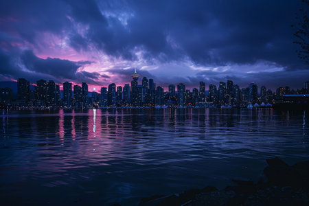 View of buildings illuminated in the city on coastline at Vancouver, Canada.