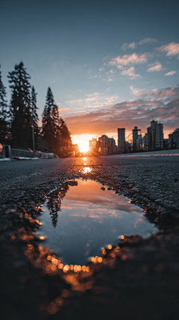 A striking sunset illuminates a cityscape, captured through a puddle's reflection. The composition displays silhouetted buildings against a colorful sky. The photograph shows natural light, with various shades. The image has potential for commercial uses such as illustrating articles or for artistic displays.