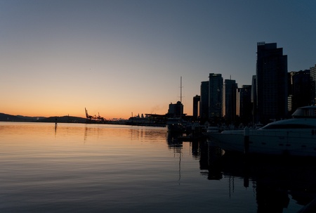 A beautiful city skyline with a calm ocean in the background. The sky is a mix of blue and orange hues, creating a serene and peaceful atmosphere