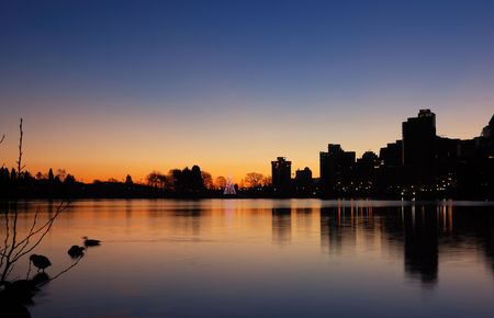 An elegant evening city skyline, lights reflecting on a calm river, skyscrapers silhouetted against a twilight sky, capturing urban beauty. Resplendent.