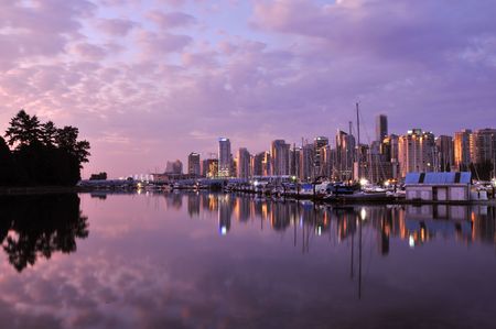 A vibrant sunset illuminates the Vancouver skyline, creating striking reflections on the calm water. The city stands silhouetted against a backdrop of pink and purple hues.