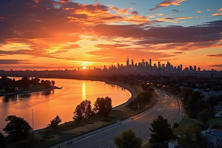 A breathtaking aerial view of a vibrant cityscape at sunset, with reflective skyscrapers and busy streets illuminating the scene as the sun sets on the horizon.