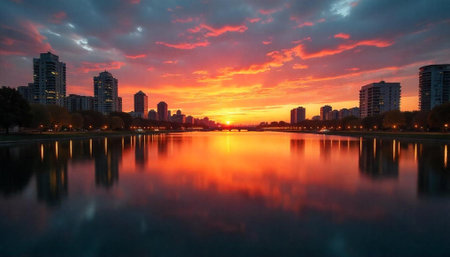 A breathtaking view of a city skyline during sunset, showcasing vibrant colors reflected in calm water. The scene captures urban beauty at dusk.