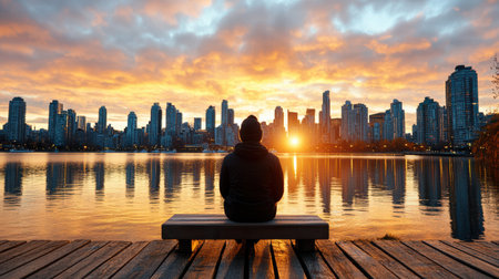 A person sitting on bench by water, watching vibrant sunset over city skyline