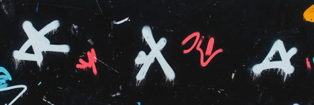 Texture of a black wall adorned with faded graffiti and vibrant grunge markings
