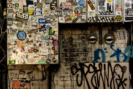 SHIBUYA, TOKYO - JAN 27: An urban street art graffiti spray paint wall with sticker bomb in the reckless dirty dark side of shibuya neighborhood central tokyo Japan on January 27, 2017.