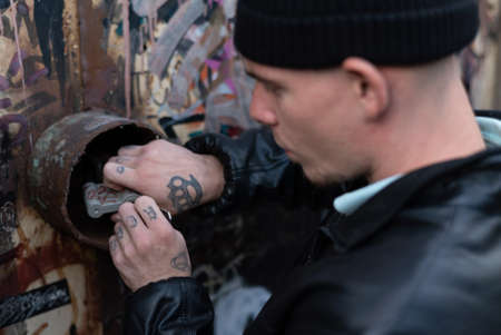 Homeless man spray painting old train wagon with aerosol can. Unrecognizable male person in conceptual image with selective focus.