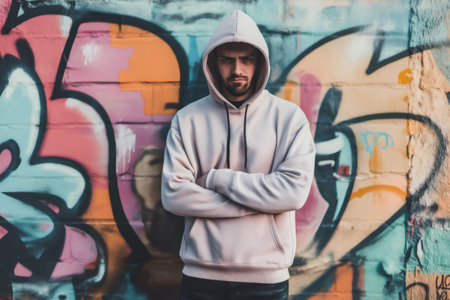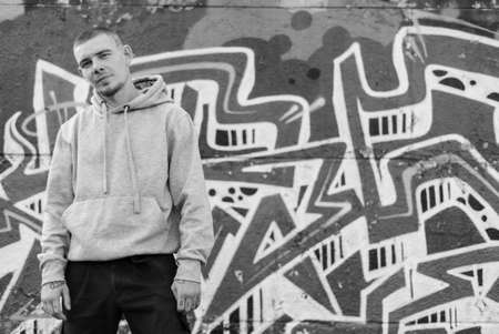 Handsome young man in hoodie standing in front of graffiti wall