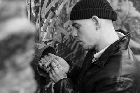 A bully guy in a light sports jacket with a hood. Black and white photo. BW