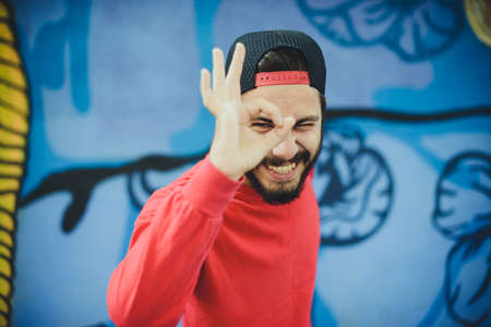 Portrait of a handsome brutal man with a beard and mustache in a baseball cap and a jacket against the background of a graffiti wall