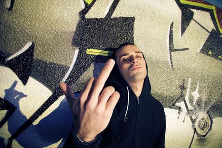 Cool looking man in a hood over abstract graffiti background
