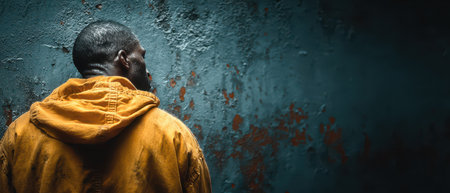 A young man with short, curly hair stars upward, his eyes wide with contemplation. He is standing against a wall with bright, colorful graffiti, the blue and yellow hues most prominent. The background adds a vibrant and artistic contrast to the man's serious expression.