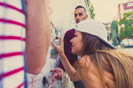 Three smiling friends with spray color are painting on an old wall