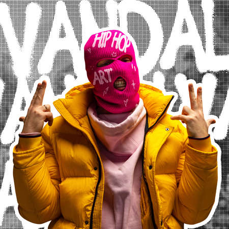 Contemporary art collage. Stylish man in pink balaclava isolated over gray background with white lettering