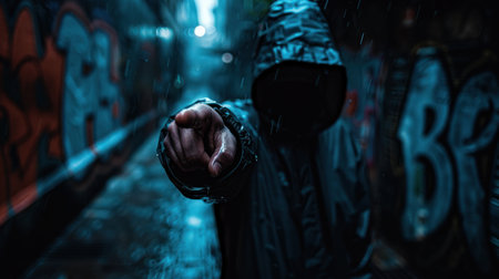 an unrecognizable man without a face in a hood shows the middle finger showing his negative attitude