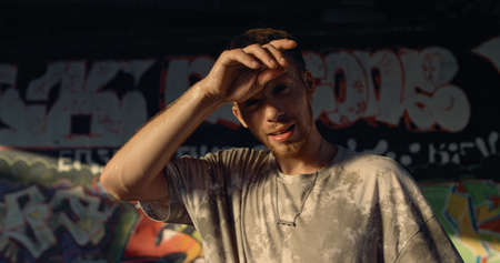 Handsome man relaxing after training at skate park with graffiti wall background. Close up tired guy looking camera at urban city skatepark. Active leisure urban subculture activity summer concept.