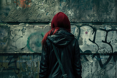 A lone figure, wearing a red beanie and a black leather jacket, stands facing a wall covered in graffiti, lost in thought.