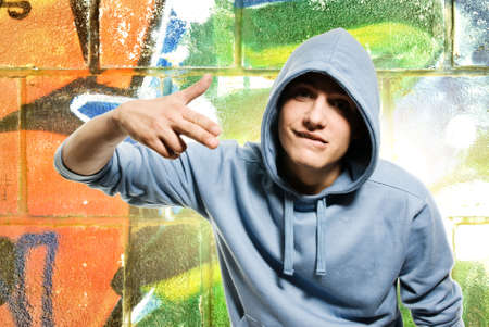 Portrait of a young man in hoodie standing against graffiti wall