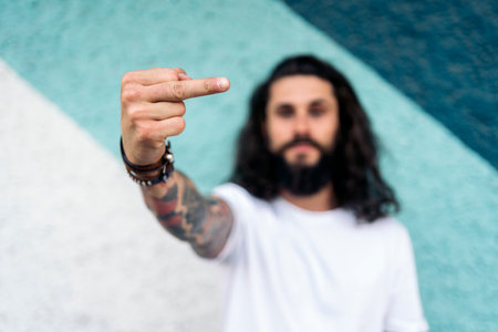 Cool hipster man with long hair posing and giving the finger against blue background.