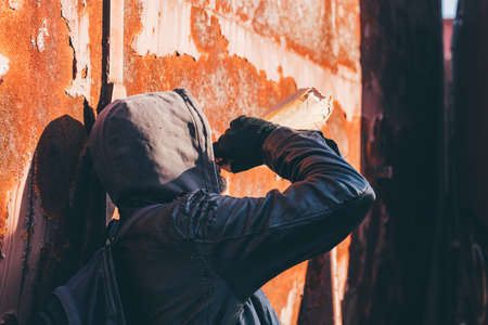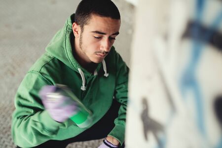 Young graffiti artist in hoodie spraying the wall. Street art concept