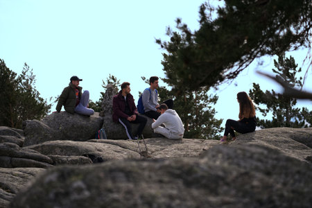Group of hikers sitting on the top of a mountain and enjoying the view