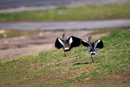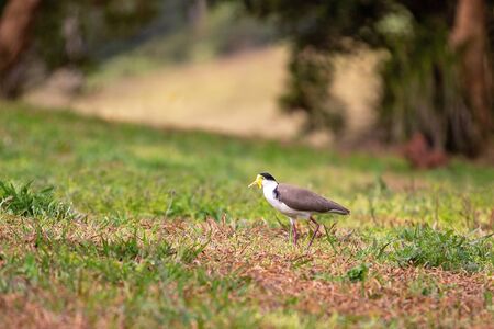 Masked lapwing (Vanellus miles) medium sized bird, animal walks on the green grass in the park.